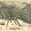 Panoramic city maps, popular at the turn of the century, depicted U.S. towns from the perspective that came to be known as bird’s-eye maps. These non-photographic old maps, depicted from oblique angles, showed street patterns, buildings and the predominant surrounding landscape in perspective. Going to great lengths to make these maps, artists would often climb surrounding hills or trees, sometimes even building platforms from which to achieve the bird’s eye” perspective. They also used to take rides in hot air balloons in order to get the proper perspective. To bolster sales of these old panoramic city maps, the artists would often choke town harbors full of ships, include proposed building developments and depict a vivacious, bustling industry. Historically interesting and beautifully drawn, it is no wonder these old panoramic city maps are making a popular comeback. Bring the spirit of your town’s history back to life with these stunning old bird’s-eye maps.”