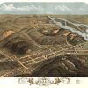 Panoramic city maps, popular at the turn of the century, depicted U.S. towns from the perspective that came to be known as bird’s-eye maps. These non-photographic old maps, depicted from oblique angles, showed street patterns, buildings and the predominant surrounding landscape in perspective. Going to great lengths to make these maps, artists would often climb surrounding hills or trees, sometimes even building platforms from which to achieve the bird’s eye” perspective. They also used to take rides in hot air balloons in order to get the proper perspective. To bolster sales of these old panoramic city maps, the artists would often choke town harbors full of ships, include proposed building developments and depict a vivacious, bustling industry. Historically interesting and beautifully drawn, it is no wonder these old panoramic city maps are making a popular comeback. Bring the spirit of your town’s history back to life with these stunning old bird’s-eye maps.”