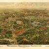 Panoramic city maps, popular at the turn of the century, depicted U.S. towns from the perspective that came to be known as bird’s-eye maps. These non-photographic old maps, depicted from oblique angles, showed street patterns, buildings and the predominant surrounding landscape in perspective. Going to great lengths to make these maps, artists would often climb surrounding hills or trees, sometimes even building platforms from which to achieve the bird’s eye” perspective. They also used to take rides in hot air balloons in order to get the proper perspective. To bolster sales of these old panoramic city maps, the artists would often choke town harbors full of ships, include proposed building developments and depict a vivacious, bustling industry. Historically interesting and beautifully drawn, it is no wonder these old panoramic city maps are making a popular comeback. Bring the spirit of your town’s history back to life with these stunning old bird’s-eye maps.”