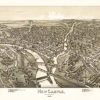 Panoramic city maps, popular at the turn of the century, depicted U.S. towns from the perspective that came to be known as bird’s-eye maps. These non-photographic old maps, depicted from oblique angles, showed street patterns, buildings and the predominant surrounding landscape in perspective. Going to great lengths to make these maps, artists would often climb surrounding hills or trees, sometimes even building platforms from which to achieve the bird’s eye” perspective. They also used to take rides in hot air balloons in order to get the proper perspective. To bolster sales of these old panoramic city maps, the artists would often choke town harbors full of ships, include proposed building developments and depict a vivacious, bustling industry. Historically interesting and beautifully drawn, it is no wonder these old panoramic city maps are making a popular comeback. Bring the spirit of your town’s history back to life with these stunning old bird’s-eye maps.”