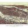Panoramic city maps, popular at the turn of the century, depicted U.S. towns from the perspective that came to be known as bird’s-eye maps. These non-photographic old maps, depicted from oblique angles, showed street patterns, buildings and the predominant surrounding landscape in perspective. Going to great lengths to make these maps, artists would often climb surrounding hills or trees, sometimes even building platforms from which to achieve the bird’s eye” perspective. They also used to take rides in hot air balloons in order to get the proper perspective. To bolster sales of these old panoramic city maps, the artists would often choke town harbors full of ships, include proposed building developments and depict a vivacious, bustling industry. Historically interesting and beautifully drawn, it is no wonder these old panoramic city maps are making a popular comeback. Bring the spirit of your town’s history back to life with these stunning old bird’s-eye maps.”