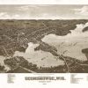 Panoramic city maps, popular at the turn of the century, depicted U.S. towns from the perspective that came to be known as bird’s-eye maps. These non-photographic old maps, depicted from oblique angles, showed street patterns, buildings and the predominant surrounding landscape in perspective. Going to great lengths to make these maps, artists would often climb surrounding hills or trees, sometimes even building platforms from which to achieve the bird’s eye” perspective. They also used to take rides in hot air balloons in order to get the proper perspective. To bolster sales of these old panoramic city maps, the artists would often choke town harbors full of ships, include proposed building developments and depict a vivacious, bustling industry. Historically interesting and beautifully drawn, it is no wonder these old panoramic city maps are making a popular comeback. Bring the spirit of your town’s history back to life with these stunning old bird’s-eye maps.”