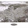 Panoramic city maps, popular at the turn of the century, depicted U.S. towns from the perspective that came to be known as bird’s-eye maps. These non-photographic old maps, depicted from oblique angles, showed street patterns, buildings and the predominant surrounding landscape in perspective. Going to great lengths to make these maps, artists would often climb surrounding hills or trees, sometimes even building platforms from which to achieve the bird’s eye” perspective. They also used to take rides in hot air balloons in order to get the proper perspective. To bolster sales of these old panoramic city maps, the artists would often choke town harbors full of ships, include proposed building developments and depict a vivacious, bustling industry. Historically interesting and beautifully drawn, it is no wonder these old panoramic city maps are making a popular comeback. Bring the spirit of your town’s history back to life with these stunning old bird’s-eye maps.”