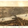 Panoramic city maps, popular at the turn of the century, depicted U.S. towns from the perspective that came to be known as bird’s-eye maps. These non-photographic old maps, depicted from oblique angles, showed street patterns, buildings and the predominant surrounding landscape in perspective. Going to great lengths to make these maps, artists would often climb surrounding hills or trees, sometimes even building platforms from which to achieve the bird’s eye” perspective. They also used to take rides in hot air balloons in order to get the proper perspective. To bolster sales of these old panoramic city maps, the artists would often choke town harbors full of ships, include proposed building developments and depict a vivacious, bustling industry. Historically interesting and beautifully drawn, it is no wonder these old panoramic city maps are making a popular comeback. Bring the spirit of your town’s history back to life with these stunning old bird’s-eye maps.”