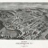 Panoramic city maps, popular at the turn of the century, depicted U.S. towns from the perspective that came to be known as bird’s-eye maps. These non-photographic old maps, depicted from oblique angles, showed street patterns, buildings and the predominant surrounding landscape in perspective. Going to great lengths to make these maps, artists would often climb surrounding hills or trees, sometimes even building platforms from which to achieve the bird’s eye” perspective. They also used to take rides in hot air balloons in order to get the proper perspective. To bolster sales of these old panoramic city maps, the artists would often choke town harbors full of ships, include proposed building developments and depict a vivacious, bustling industry. Historically interesting and beautifully drawn, it is no wonder these old panoramic city maps are making a popular comeback. Bring the spirit of your town’s history back to life with these stunning old bird’s-eye maps.”