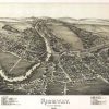 Panoramic city maps, popular at the turn of the century, depicted U.S. towns from the perspective that came to be known as bird’s-eye maps. These non-photographic old maps, depicted from oblique angles, showed street patterns, buildings and the predominant surrounding landscape in perspective. Going to great lengths to make these maps, artists would often climb surrounding hills or trees, sometimes even building platforms from which to achieve the bird’s eye” perspective. They also used to take rides in hot air balloons in order to get the proper perspective. To bolster sales of these old panoramic city maps, the artists would often choke town harbors full of ships, include proposed building developments and depict a vivacious, bustling industry. Historically interesting and beautifully drawn, it is no wonder these old panoramic city maps are making a popular comeback. Bring the spirit of your town’s history back to life with these stunning old bird’s-eye maps.”