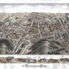 Panoramic city maps, popular at the turn of the century, depicted U.S. towns from the perspective that came to be known as bird’s-eye maps. These non-photographic old maps, depicted from oblique angles, showed street patterns, buildings and the predominant surrounding landscape in perspective. Going to great lengths to make these maps, artists would often climb surrounding hills or trees, sometimes even building platforms from which to achieve the bird’s eye” perspective. They also used to take rides in hot air balloons in order to get the proper perspective. To bolster sales of these old panoramic city maps, the artists would often choke town harbors full of ships, include proposed building developments and depict a vivacious, bustling industry. Historically interesting and beautifully drawn, it is no wonder these old panoramic city maps are making a popular comeback. Bring the spirit of your town’s history back to life with these stunning old bird’s-eye maps.”