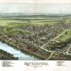 Panoramic city maps, popular at the turn of the century, depicted U.S. towns from the perspective that came to be known as bird’s-eye maps. These non-photographic old maps, depicted from oblique angles, showed street patterns, buildings and the predominant surrounding landscape in perspective. Going to great lengths to make these maps, artists would often climb surrounding hills or trees, sometimes even building platforms from which to achieve the bird’s eye” perspective. They also used to take rides in hot air balloons in order to get the proper perspective. To bolster sales of these old panoramic city maps, the artists would often choke town harbors full of ships, include proposed building developments and depict a vivacious, bustling industry. Historically interesting and beautifully drawn, it is no wonder these old panoramic city maps are making a popular comeback. Bring the spirit of your town’s history back to life with these stunning old bird’s-eye maps.”