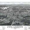Panoramic city maps, popular at the turn of the century, depicted U.S. towns from the perspective that came to be known as bird’s-eye maps. These non-photographic old maps, depicted from oblique angles, showed street patterns, buildings and the predominant surrounding landscape in perspective. Going to great lengths to make these maps, artists would often climb surrounding hills or trees, sometimes even building platforms from which to achieve the bird’s eye” perspective. They also used to take rides in hot air balloons in order to get the proper perspective. To bolster sales of these old panoramic city maps, the artists would often choke town harbors full of ships, include proposed building developments and depict a vivacious, bustling industry. Historically interesting and beautifully drawn, it is no wonder these old panoramic city maps are making a popular comeback. Bring the spirit of your town’s history back to life with these stunning old bird’s-eye maps.”