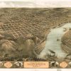 Panoramic city maps, popular at the turn of the century, depicted U.S. towns from the perspective that came to be known as bird’s-eye maps. These non-photographic old maps, depicted from oblique angles, showed street patterns, buildings and the predominant surrounding landscape in perspective. Going to great lengths to make these maps, artists would often climb surrounding hills or trees, sometimes even building platforms from which to achieve the bird’s eye” perspective. They also used to take rides in hot air balloons in order to get the proper perspective. To bolster sales of these old panoramic city maps, the artists would often choke town harbors full of ships, include proposed building developments and depict a vivacious, bustling industry. Historically interesting and beautifully drawn, it is no wonder these old panoramic city maps are making a popular comeback. Bring the spirit of your town’s history back to life with these stunning old bird’s-eye maps.”
