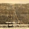 Panoramic city maps, popular at the turn of the century, depicted U.S. towns from the perspective that came to be known as bird’s-eye maps. These non-photographic old maps, depicted from oblique angles, showed street patterns, buildings and the predominant surrounding landscape in perspective. Going to great lengths to make these maps, artists would often climb surrounding hills or trees, sometimes even building platforms from which to achieve the bird’s eye” perspective. They also used to take rides in hot air balloons in order to get the proper perspective. To bolster sales of these old panoramic city maps, the artists would often choke town harbors full of ships, include proposed building developments and depict a vivacious, bustling industry. Historically interesting and beautifully drawn, it is no wonder these old panoramic city maps are making a popular comeback. Bring the spirit of your town’s history back to life with these stunning old bird’s-eye maps.”
