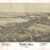 Panoramic city maps, popular at the turn of the century, depicted U.S. towns from the perspective that came to be known as bird’s-eye maps. These non-photographic old maps, depicted from oblique angles, showed street patterns, buildings and the predominant surrounding landscape in perspective. Going to great lengths to make these maps, artists would often climb surrounding hills or trees, sometimes even building platforms from which to achieve the bird’s eye” perspective. They also used to take rides in hot air balloons in order to get the proper perspective. To bolster sales of these old panoramic city maps, the artists would often choke town harbors full of ships, include proposed building developments and depict a vivacious, bustling industry. Historically interesting and beautifully drawn, it is no wonder these old panoramic city maps are making a popular comeback. Bring the spirit of your town’s history back to life with these stunning old bird’s-eye maps.”
