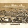 Panoramic city maps, popular at the turn of the century, depicted U.S. towns from the perspective that came to be known as bird’s-eye maps. These non-photographic old maps, depicted from oblique angles, showed street patterns, buildings and the predominant surrounding landscape in perspective. Going to great lengths to make these maps, artists would often climb surrounding hills or trees, sometimes even building platforms from which to achieve the bird’s eye” perspective. They also used to take rides in hot air balloons in order to get the proper perspective. To bolster sales of these old panoramic city maps, the artists would often choke town harbors full of ships, include proposed building developments and depict a vivacious, bustling industry. Historically interesting and beautifully drawn, it is no wonder these old panoramic city maps are making a popular comeback. Bring the spirit of your town’s history back to life with these stunning old bird’s-eye maps.”