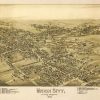 Panoramic city maps, popular at the turn of the century, depicted U.S. towns from the perspective that came to be known as bird’s-eye maps. These non-photographic old maps, depicted from oblique angles, showed street patterns, buildings and the predominant surrounding landscape in perspective. Going to great lengths to make these maps, artists would often climb surrounding hills or trees, sometimes even building platforms from which to achieve the bird’s eye” perspective. They also used to take rides in hot air balloons in order to get the proper perspective. To bolster sales of these old panoramic city maps, the artists would often choke town harbors full of ships, include proposed building developments and depict a vivacious, bustling industry. Historically interesting and beautifully drawn, it is no wonder these old panoramic city maps are making a popular comeback. Bring the spirit of your town’s history back to life with these stunning old bird’s-eye maps.”