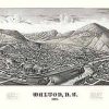 Panoramic city maps, popular at the turn of the century, depicted U.S. towns from the perspective that came to be known as bird’s-eye maps. These non-photographic old maps, depicted from oblique angles, showed street patterns, buildings and the predominant surrounding landscape in perspective. Going to great lengths to make these maps, artists would often climb surrounding hills or trees, sometimes even building platforms from which to achieve the bird’s eye” perspective. They also used to take rides in hot air balloons in order to get the proper perspective. To bolster sales of these old panoramic city maps, the artists would often choke town harbors full of ships, include proposed building developments and depict a vivacious, bustling industry. Historically interesting and beautifully drawn, it is no wonder these old panoramic city maps are making a popular comeback. Bring the spirit of your town’s history back to life with these stunning old bird’s-eye maps.”