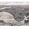 Panoramic city maps, popular at the turn of the century, depicted U.S. towns from the perspective that came to be known as bird’s-eye maps. These non-photographic old maps, depicted from oblique angles, showed street patterns, buildings and the predominant surrounding landscape in perspective. Going to great lengths to make these maps, artists would often climb surrounding hills or trees, sometimes even building platforms from which to achieve the bird’s eye” perspective. They also used to take rides in hot air balloons in order to get the proper perspective. To bolster sales of these old panoramic city maps, the artists would often choke town harbors full of ships, include proposed building developments and depict a vivacious, bustling industry. Historically interesting and beautifully drawn, it is no wonder these old panoramic city maps are making a popular comeback. Bring the spirit of your town’s history back to life with these stunning old bird’s-eye maps.”