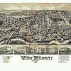 Panoramic city maps, popular at the turn of the century, depicted U.S. towns from the perspective that came to be known as bird’s-eye maps. These non-photographic old maps, depicted from oblique angles, showed street patterns, buildings and the predominant surrounding landscape in perspective. Going to great lengths to make these maps, artists would often climb surrounding hills or trees, sometimes even building platforms from which to achieve the bird’s eye” perspective. They also used to take rides in hot air balloons in order to get the proper perspective. To bolster sales of these old panoramic city maps, the artists would often choke town harbors full of ships, include proposed building developments and depict a vivacious, bustling industry. Historically interesting and beautifully drawn, it is no wonder these old panoramic city maps are making a popular comeback. Bring the spirit of your town’s history back to life with these stunning old bird’s-eye maps.”