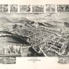 Panoramic city maps, popular at the turn of the century, depicted U.S. towns from the perspective that came to be known as bird’s-eye maps. These non-photographic old maps, depicted from oblique angles, showed street patterns, buildings and the predominant surrounding landscape in perspective. Going to great lengths to make these maps, artists would often climb surrounding hills or trees, sometimes even building platforms from which to achieve the bird’s eye” perspective. They also used to take rides in hot air balloons in order to get the proper perspective. To bolster sales of these old panoramic city maps, the artists would often choke town harbors full of ships, include proposed building developments and depict a vivacious, bustling industry. Historically interesting and beautifully drawn, it is no wonder these old panoramic city maps are making a popular comeback. Bring the spirit of your town’s history back to life with these stunning old bird’s-eye maps.”