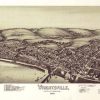 Panoramic city maps, popular at the turn of the century, depicted U.S. towns from the perspective that came to be known as bird’s-eye maps. These non-photographic old maps, depicted from oblique angles, showed street patterns, buildings and the predominant surrounding landscape in perspective. Going to great lengths to make these maps, artists would often climb surrounding hills or trees, sometimes even building platforms from which to achieve the bird’s eye” perspective. They also used to take rides in hot air balloons in order to get the proper perspective. To bolster sales of these old panoramic city maps, the artists would often choke town harbors full of ships, include proposed building developments and depict a vivacious, bustling industry. Historically interesting and beautifully drawn, it is no wonder these old panoramic city maps are making a popular comeback. Bring the spirit of your town’s history back to life with these stunning old bird’s-eye maps.”