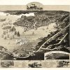 This breathtaking view of Boothbay Harbor, Maine shows the harbor as it was in 1885. The map shows locations of various churches, a pharmacy, a shoe store, ice house, grocery, cottages, and numerous wharves. In the inset, the map features the Eastern Steamboat’s line to Boston, Maddock’s Canning Factory, J.C. Poole.’s Packers & Fitters, and Nickerson & Son’s Packer and Fitters.