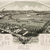 This aerial view by A.F. Poole features Augusta, Maine in 1885. The image shows the locations of the brigade headquarters, hospital, band quarters, and more, with each location denoting the captain running it. Up to 40 camp locations are indicated.