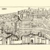 This beautiful illustration in the Nuremberg Chronicle” shows Rome, Italy under the papacy of Alexander VI. He was responsible for “restoring” the Castle of St. Angelo, while his successor, Julius II, was primarily preoccupied with the question of demolishing the old St. Peter’s Basilica. The great redevelopment schemes of Sixtus V were nearly a century away.”