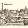 This beautiful illustration of Vienna, Austria was created in 1493. The romantic, stylized view shows the walled city whose skyline is punctuated by towered fortifications and tall steeples, amidst a domesticated landscape.