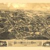 Panoramic city maps, popular at the turn of the century, depicted U.S. towns from the perspective that came to be known as bird’s-eye maps. These non-photographic old maps, depicted from oblique angles, showed street patterns, buildings and the predominant surrounding landscape in perspective. Going to great lengths to make these maps, artists would often climb surrounding hills or trees, sometimes even building platforms from which to achieve the bird’s eye” perspective. They also used to take rides in hot air balloons in order to get the proper perspective. To bolster sales of these old panoramic city maps, the artists would often choke town harbors full of ships, include proposed building developments and depict a vivacious, bustling industry. Historically interesting and beautifully drawn, it is no wonder these old panoramic city maps are making a popular comeback. Bring the spirit of your town’s history back to life with these stunning old bird’s-eye maps.”