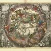 Although little is known about the life of Andreas Cellarius (born around 1596), his work Atlas Coelestis, seu Harmonia Macrocosmica” is well known among collectors of celestial maps for the unique Baroque style of its 29 double plates. The first 21 plates constitute a historical survey of cosmological theories, illustrating the motions of the sun and planets according to Ptolemy, Copernicus and Tycho Brahe. The last eight plates are celestial hemispheres and planispheres depicting the constellations; they are the most ornate of all, and their level of artistic detail has made these plates popular among collectors of fine art. Cellarius� atlas had its first printing in 1660 and went through two subsequent printings in 1661 and 1666. Theses images come from a reprint by the Amsterdam publishers Gerard Valk and Petrus Schenk, who purchased the original plates in 1694 and in 1708 produced a new edition of the Harmonia Macrocosmica without the extensive Latin text that had accompanied the original printings. This particular map is of the southern hemisphere of both the starry vault and the Earth, shown scenographically. It is plate number 28.”