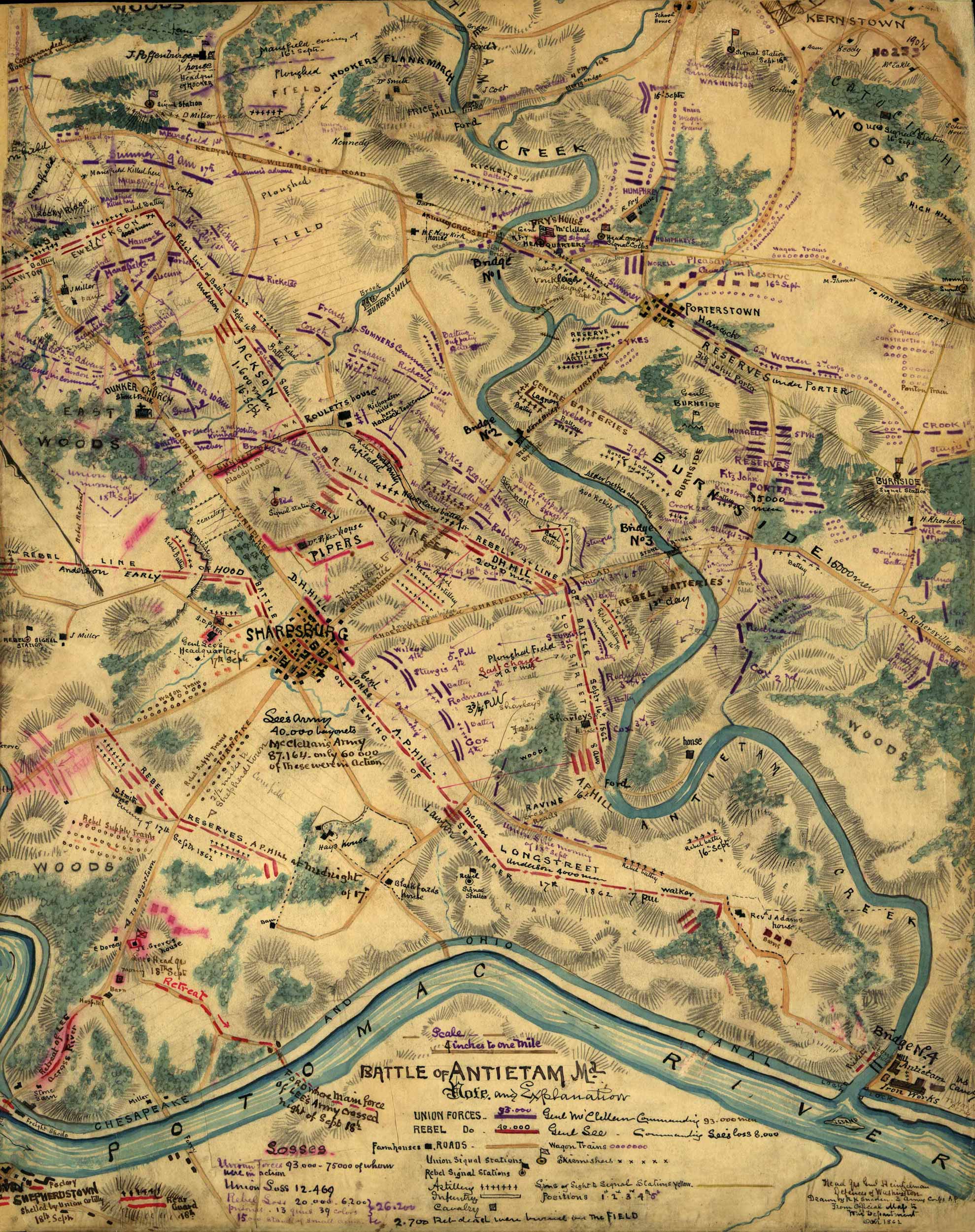 This map shows the location and details of the Battle of Antietam, near Sharpsburg, Maryland. The map was created by Robert Knox Sneden in 1862, the year the battle occurred. Includes depictions of the Chesapeake and Ohio Canal, the Potomac River, the Antietam Iron Works, and the Union and Confederate signal stations.