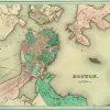 This map shows the growth of the city beyond the Shawmut Peninsula. The introduction of railroads, and construction of bridges connected the city with its fast growing neighboring communities of Cambridge, Charlestown and South Boston. Names the early railroads of Providence and Lowell (both completed in 1835) with their lines entering the city. Details bridges, ferry lines, roads, forts and more.
