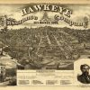 This is a very unique bird’s eye view with a large title, Hawkeye Insurance Co.” It includes illustrations as well as an index to points of interest. “