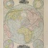 This map was made by George F. Cram for “Crams Unrivaled Family Atlas” in 1883. Five perspectives of the world are illustrated on this page. The southern and northern regions, the greatest masses of water and land, and the world projected from the north pole are shown.