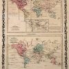 This antique map came from Johnson’s New Illustrated (Steel Plate) Family Atlas, published in 1864, by Johnson and Ward. These maps are some of the most colorful and accurate maps produced in the 1860’s. Johnson maps are characterized by hand coloring in red and green and distinctive borders, including iron scrollwork and a Celtic design. These two maps include illustrations of the animal kingdom, productive industry and bird districts.
