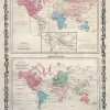 This antique map came from Johnsons New Illustrated (Steel Plate) Family Atlas, published in 1863, by Johnson and Ward. These maps are some of the most colorful and accurate maps produced in the 1860’s. Johnson maps are characterized by hand coloring in red and green and distinctive borders, including iron scrollwork and a Celtic design. These two maps include illustrations of the animal kingdom, productive industry and bird districts.