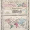 This antique map came from Johnson’s New Illustrated (Steel Plate) Family Atlas, published in 1863, by Johnson and Browning. These maps are some of the most colorful and accurate maps produced in the 1860’s. Johnson maps are characterized by hand coloring in red and green and distinctive borders, including iron scrollwork and a Celtic design. These two maps illustrate the features of meteorology and plants of the world, and includes an inset of a rain map.