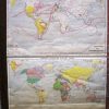 This double map of the World was published by Denoyer-Gepper Co. in 1916. The top map is The World in 1914 with inset maps in the corners of India under Clive and Hastings, and another of the West Indies, 1763. The routes of Marco Polo, Columbus, John Cabot, Vasco da Gama, Magellan, Drake, and Cook. Other indications include land and caravan routes of Spanish, Portuguese, Dutch, French and British. The bottom map is Discoveries and Colonizations in 1763. Insets of India-1858 and Russo-Japanese War (1904-5). The map key indicates Colonies and Dependencies by color by county. This map is hung by wooden dowels. It is in good condition with age toning, cracks, and some paper loss, mainly at bottom map. Additional pictures are available. Appx size: 59.5″ x 42″, with dowel: 66″ x 44″