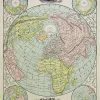 This map was published for “Crams Unrivaled Family Atlas of the World” in 1885. The world in five perspectives is illustrated on this page. Views of the northern region, southern region, greatest mass of water, and the greatest mass of land surround a global perspective of the world continents are differentiated by color, place names and some topographical features are noted.