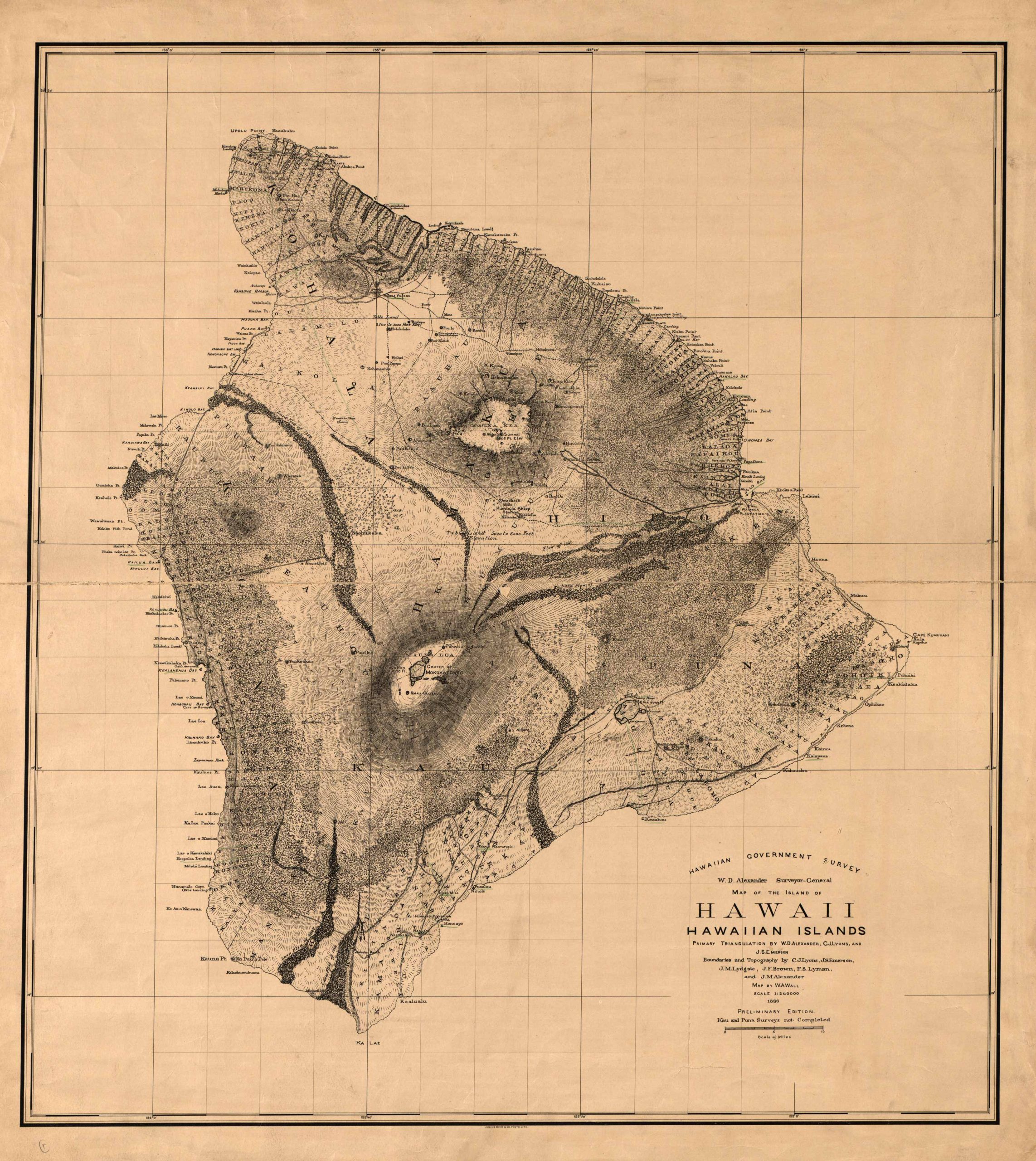 Map of the Island of Hawaii, Hawaiian Islands. Published by the Hawaiian Government Survey printed in 1886, W.D. Alexander Surveyor-General, map by W.A. Wall. This map of the big island of Hawaii depicts many different natural and man-made features such as bays, coves and shoreline names all along the coast of the island, elevation readings, harbors, towns and cities, craters such as Mukuaweoweo crater. This detailed map even shows small farms and many other features including: Kahuku Ranch, Honuapo Plantation, Kuana Pt., Kawaihae Harbor, Puako Bay among many, many others. Also featured are topographic lines.