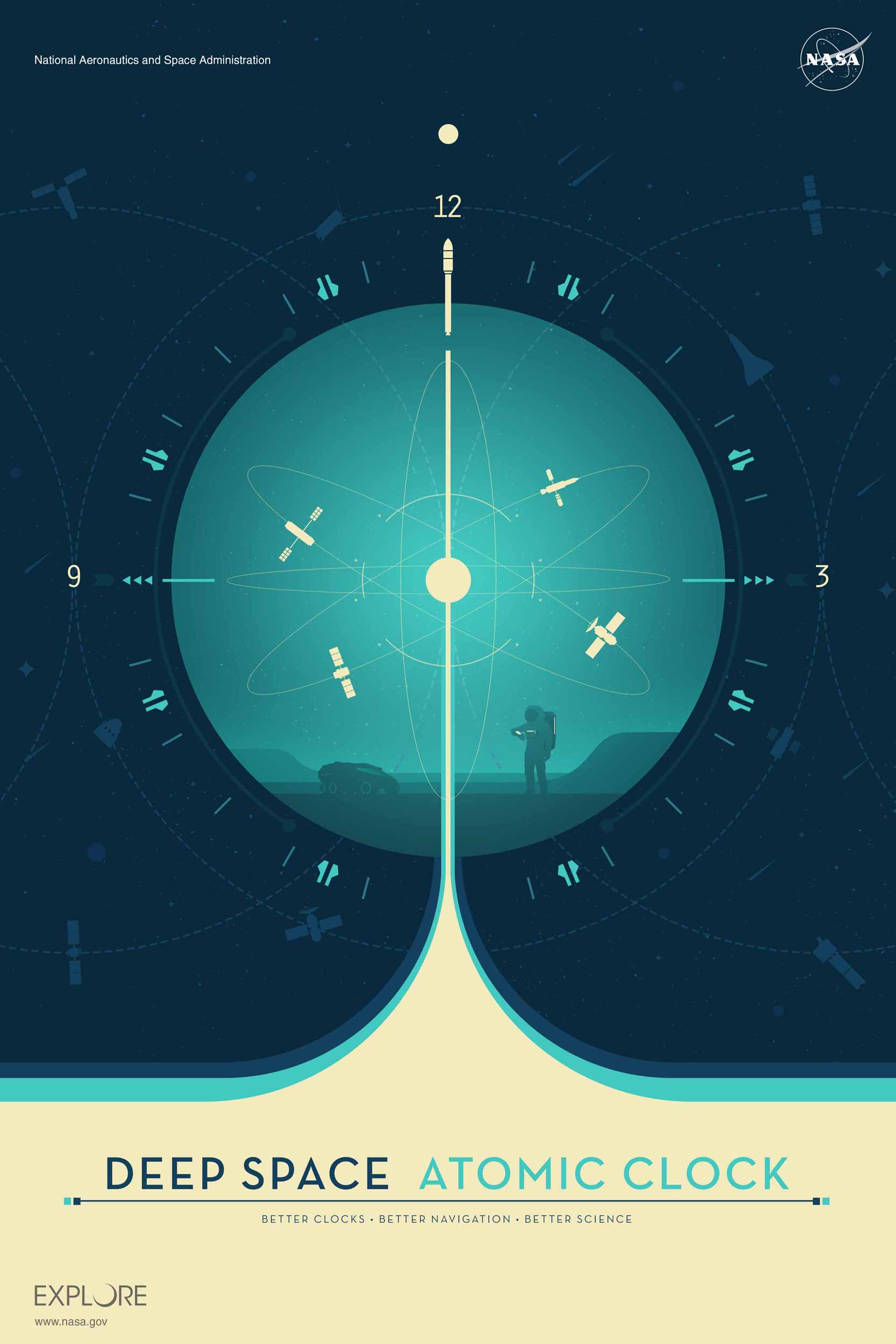 Part of NASA’s Jet Propulsion Laboratory 2019 curated poster gallery, “Visions of the Future.” Deep space atomic clock in blue.