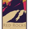 14er Red Rocks poster by artist Blair Hamill. Evening in the foothills and bold red and tan sandstone formations rise into the sky in our Red Rocks – Moon poster art print. From this unique destination one can capture amazing views and memories of music, Easter Sunrise services, or “yoga on the rocks”. This open-air amphitheater provides visual and musical acoustics high above the town of Morrison, Colorado overlooking the Denver Metro area in the distance.