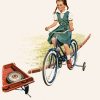 This antique print is most likely from an old picture book for children. Picture books are aimed mostly at young children with basic knowledge designed to help children develop their reading skills. This print is in the illustration style of the Dick and Jane variety with limited vocabulary and short phrases, easy for learning to read. This beautiful illustration shows Betty riding her bike around the neighborhood. Combine this illustration with others in our collection for a great framed set for any nursery, playroom, or child’s room to promote learning and reading.