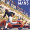 Poster depicting racers in line with their cars to a background of a stadium with colorful flags streaming at the top.