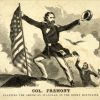 This poster was a proof for a large woodcut campaign banner or poster for John C. Fremont, Republican presidential contender in 1856. Fremont is shown in full-length on a mountain peak, planting an American flag. An eagle soars in the air beyond them, which symbolizes America. This scene was no doubt intended to evoke heroic memories of Fremont’s famous exploring expeditions to the Rocky Mountains in 1842 and 1843.