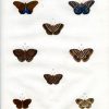 This exquisitely rendered natural history print is from a rare monograph on butterflies from famous collections of specimens of the period, which was produced by Dutch butterfly experts. The plate combines scientific accuracy and a sophisticated aesthetic sense in terms of the arrangements of butterflies, as well as in the depiction of colors and decorative patterns. The entire work (Papillons Exotiques des Trois parties du Monde: l’Asie, l’Afrique et l’Amerique” [“Exotic Butterflies from Three Parts of the World: Asia, Africa and America”]) represents the first color book on exotic butterflies arranged in accordance with the Linnean system of classification. Pieter Cramer (1721-1776) was a merchant in Spanish wool with a great interest in butterflies. He began the project of editing this comprehensive illustrated publication, but when he died in the midst of it, the remaining volumes were edited by C. Stoll. The painter Gerrit Wartenaar Lambertz was commissioned to paint first the butterflies in Cramer’s collection and then in other “cabinets of curiosities. Throughout the book names of owners of Cabinets are mentioned, including Pieter Boddaert, Houttuin, P. Luchtmans, Prince Willem, Baron van Rengers and many others. Lambertz depicted over 1,650 species of butterflies in top and bottom views at life size. The beautiful copperplate engravings were finished with delicate realistic handcoloring.